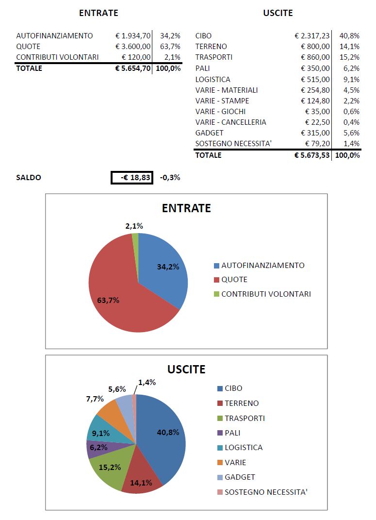 Dopo aver deciso di mantenere il più possibile bassa la quota (visto l’attuale situazione di crisi economica in Italia), non incrementandola rispetto agli scorsi anni e aver destinato l’intero incasso dell’autofinanziamento alle spese del campo estivo, siamo riusciti a chiudere con un deficit minimo di 18,83€, ripianato con il residuo di cassa degli anni precedenti.