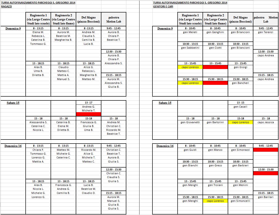 ecco i turni per l’autofinanziamento dei parcheggi per la fiera di San Gregorio i parcheggi saranno 4 (Motion Lab, Del Magno e 2 vicino a Ragioneria) e le giornate 3 (le due domeniche e il secondo sabato) ci sono ancora alcune caselle da riempire (le trovate evidenziate in rosso) e se qualcuno volesse liberare Lorenzo da uno dei suoi 4 turni ci farebbe cosa gradita (li trovate evidenziati in giallo) per eventuali problemi vi chiediamo di organizzarvi all’interno delle famiglie per scambiare/coprire turni, e solo in ultima istanza di contattare noi capi perchè ovviamente non è facile coordinare le tante esigenze per i ragazzi e genitori non ancora inseriti in nessun turno, guardate dove ci sono dei buchi e fatecelo sapere in modo da aggiornare le liste CLICCATE SULL’IMMAGINE PER VISUALIZZARLA INGRANDITA!
